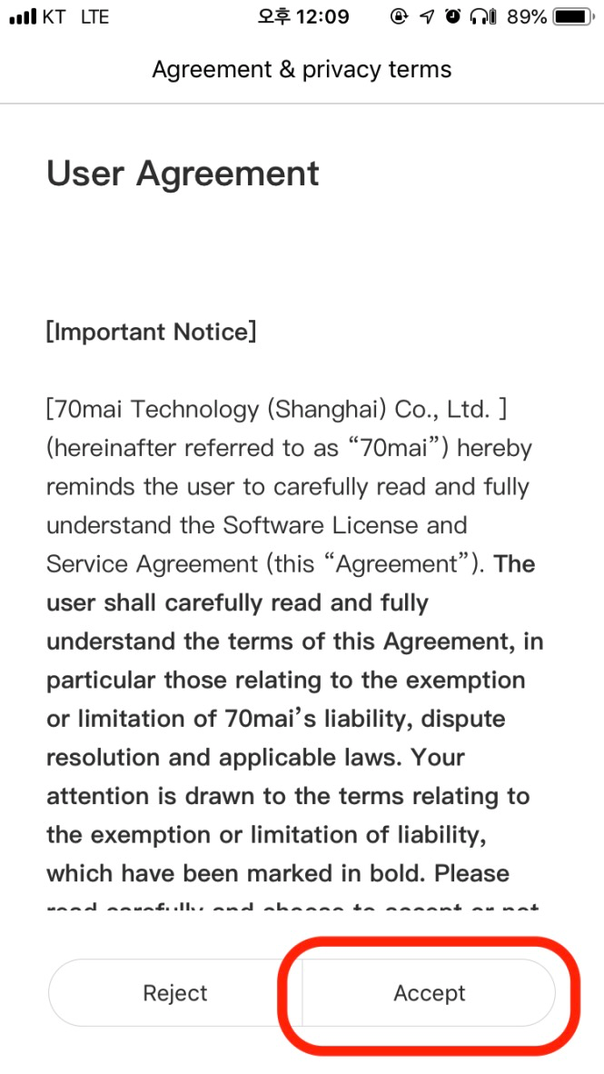 - 앱 화면으로 넘어오면 인증을 위해 70mai의 전원버튼을 누르라고 뜨며, 전원 버튼을 누르고 기다리면 70mai와 연동이 된다.