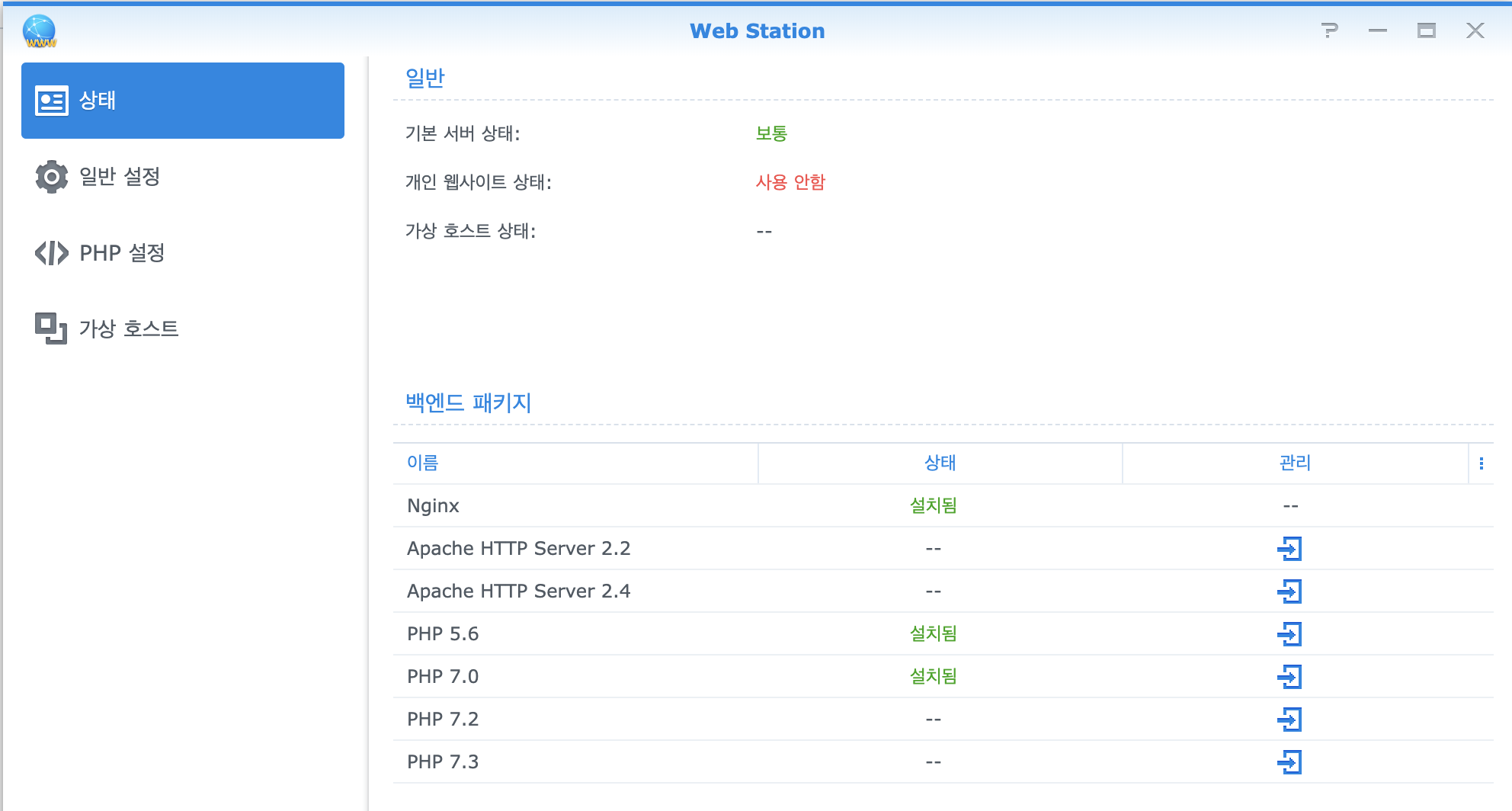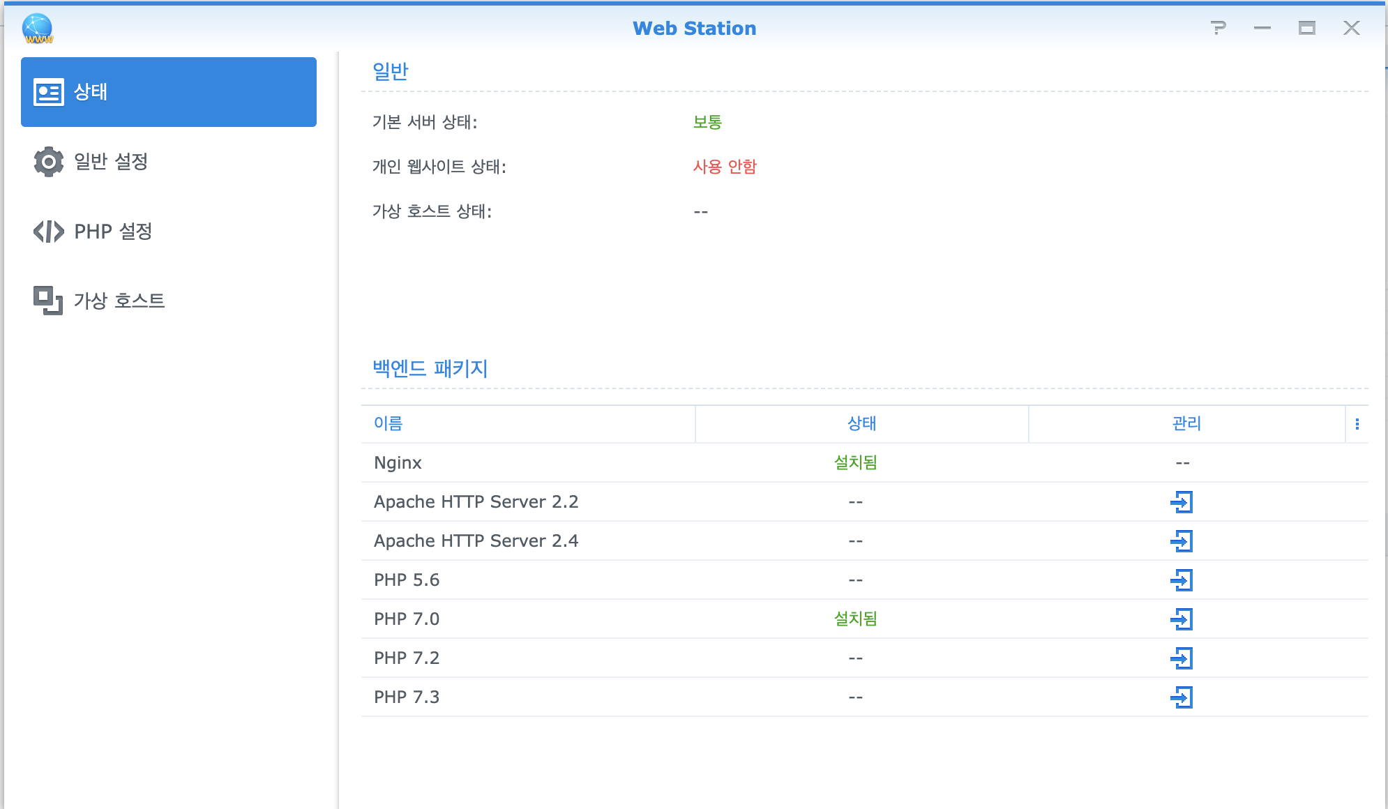 1-1. 디폴트로 PHP 7.0을 사용하도록 되어 있는데 필요한 버전의 PHP 버전을 패키지 센터에서 설치하면 된다. 나의 경우 PHP 5.6을 설치함