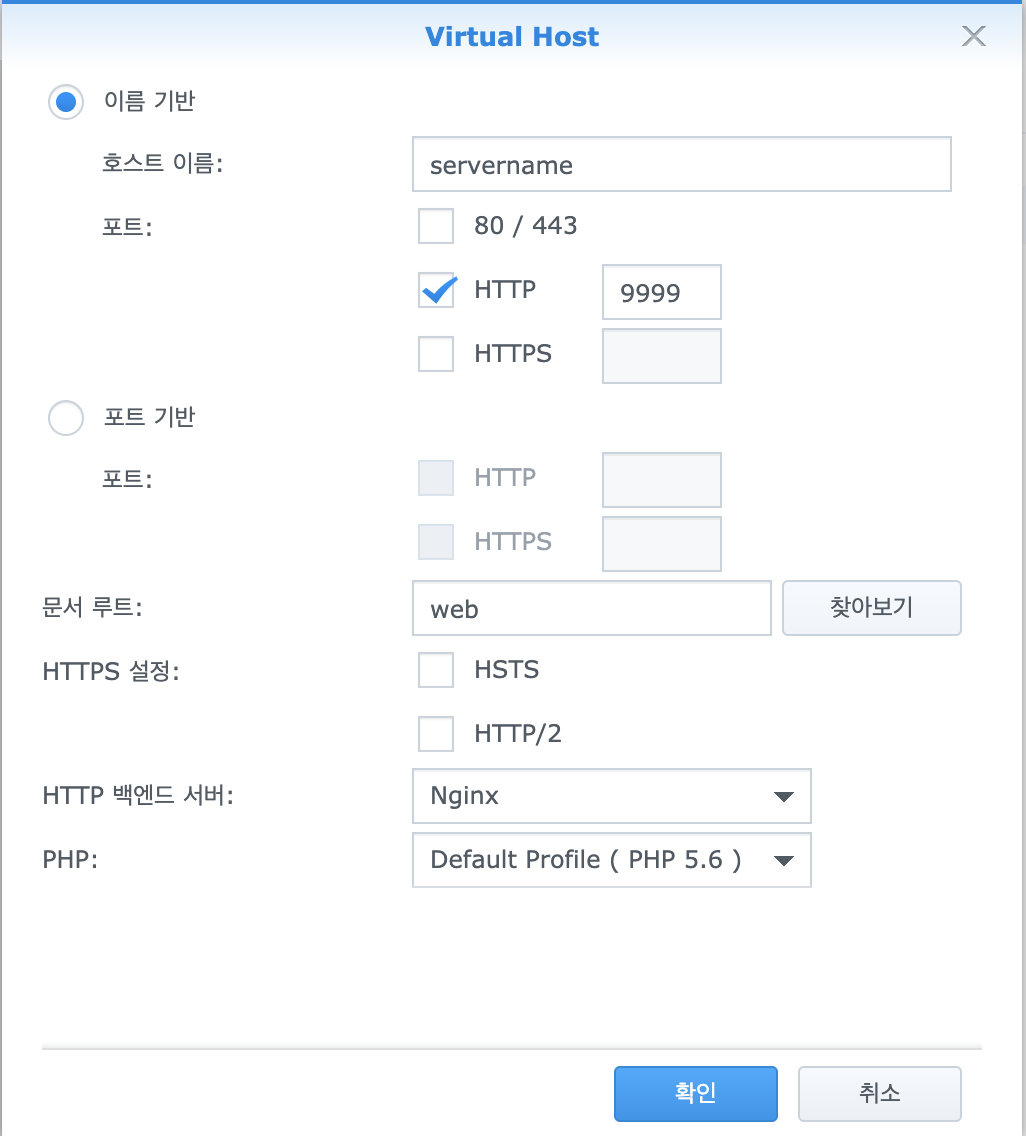 2. Web Station 가상 호스트 탭에서 접속하기를 원하는 포트와 directory 정보, 웹서버 정보등을 설정한다.